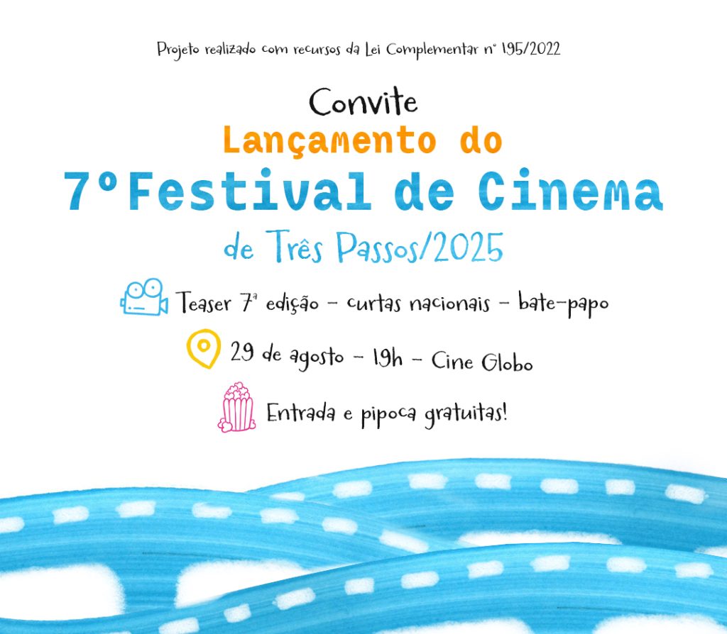 No dia 29 de agosto, às 19h, no Cine Globo, acontece o Lançamento do 7º Festival de Cinema de Três Passos/2025, festival que se constitui como amostra de como o cinema pode ser um instrumento de preservação da memória, fortalecimento da cultura e promoção do desenvolvimento local.